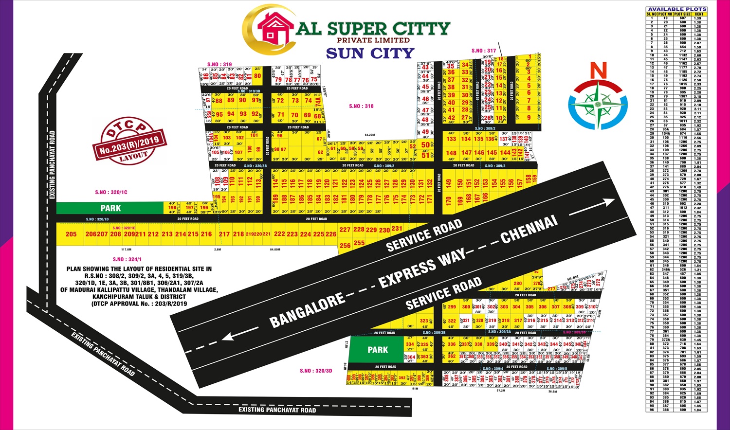 Sun City, developed by AL Super City, is a premium gated community project located in Parandur, a rapidly developing destination in Chennai. Spread across 3 acres, this development offers 96 well-planned residential plots ranging from 457 sq.ft. to 1260 sq.ft., with prices starting from just ₹9.14 Lakhs to ₹25.2 Lakhs. At an attractive rate of ₹2,000 per sq.ft., Sun City presents the perfect opportunity to build your dream home or make a smart investment.